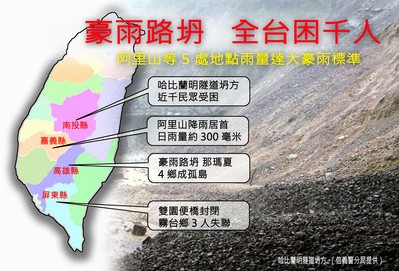 南投縣信義鄉(xiāng)神木村23日雨量累積超過170毫米,造成愛玉子溪便道遭泥石流阻斷,參加喜宴的400多名賓客受困,幸好村長(zhǎng)鐘桂南搶通另一條大石爺便道,所有賓客全部脫困。