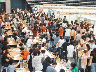 一早即有不少民眾排長龍?zhí)顚懧臍v,會(huì)場(chǎng)內(nèi)滿是人潮,59歲的苗栗市民蔡輝煌穿梭各個(gè)攤位,盼尋找適合的工作。他原是銀行行員,兩年前退休,他說,經(jīng)濟(jì)不景氣,物價(jià)暴漲,退休金不夠養(yǎng)老,退休后的規(guī)劃也亂了,打算再出來找工作。