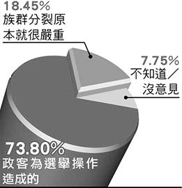 記者:根據(jù)臺灣的民調(diào),在現(xiàn)在臺灣的政治現(xiàn)實里面,隨著藍綠的斗爭,族群議題好像炒作得越來越嚴重?