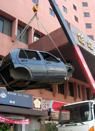 臺(tái)灣戲劇表演家“我是你爸爸”舞臺(tái)劇二十日在高雄市開演,劇團(tuán)克服演出場(chǎng)地限制,將一輛報(bào)廢汽車吊掛至舞臺(tái),在舞臺(tái)上呈現(xiàn)噱頭。“中央社”圖 程啟峰 攝