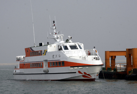 一百八十二人座“仙洲號(hào)”交通船已經(jīng)駛抵金門(mén),將于明年初投入大小金門(mén)海上輸運(yùn)行列!爸醒肷纭眻D 倪國(guó)炎 攝