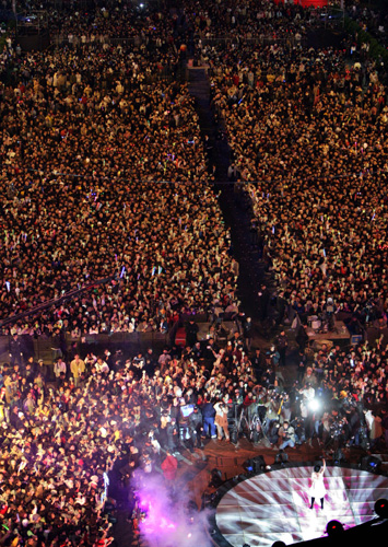臺(tái)北市政府前廣場(chǎng)十二月三十一日舉辦“2008臺(tái)北最HIGH新年城”跨年晚會(huì),炫麗的舞臺(tái)燈光和精彩的藝人表演,吸引上萬(wàn)的民眾一起前來參加跨年晚會(huì)。(“中央社”圖;張皓安攝)
