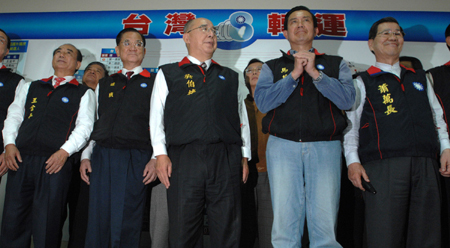 國民黨在十二日“立委”選舉中大勝,國民黨中央黨部晚間舉行記者會(huì),黨主席吳伯雄表示不敢懈怠,高興只要一晚就好,接下來還有“大選”要拼。國民黨“大選”參選人馬英九則拱手感謝民眾支持。“中央社”圖 王飛華 攝