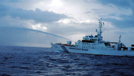 臺灣“全家福”保釣船十六日搭載著保釣人士前往釣魚島宣示“主權(quán)”,不過,日本保安廳巡邏艦出動十多艘,還噴水、企圖碰撞、排黑煙、及蛇行引側(cè)浪企圖阻撓。保釣人士丟擲飲料瓶抗議。“中央社”圖