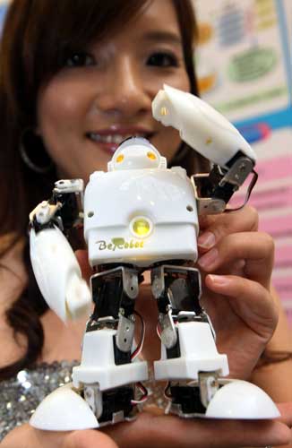 臺北國際機器人展八月二十一日在臺北世貿(mào)展覽館開幕,其中,榮獲吉尼斯世界紀錄全世界最小的教育娛樂機器人,由臺灣自行開發(fā),可程序編輯創(chuàng)造更多使用價值。(“中央社”圖)