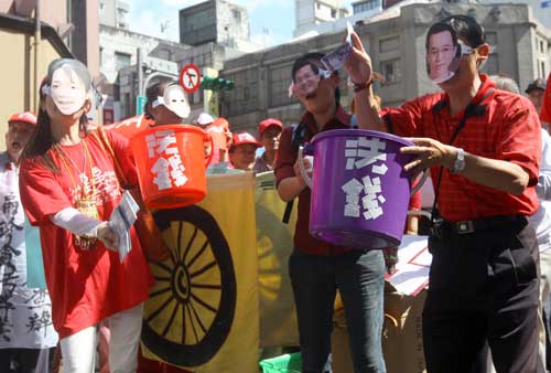 紅衫軍演出街頭行動(dòng)劇諷刺陳水扁一家洗錢。(“中央社”圖)