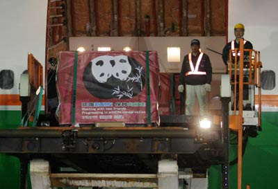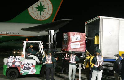 贈(zèng)臺(tái)大熊貓抵達(dá)臺(tái)北桃園機(jī)場(chǎng),圖為工作人員展開裝載作業(yè) “中央社”圖