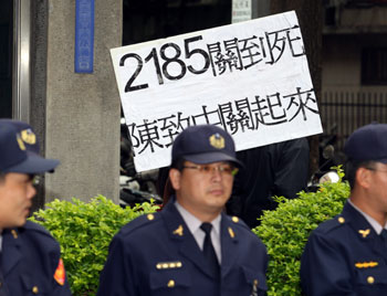 臺(tái)北地方法院21日審理陳水扁家庭洗錢案,庭外有民眾舉牌“把陳致中關(guān)起來(lái)” “中央社”圖