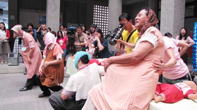 中新網3月4日電 據(jù)“中央社”報道,屏東縣4日舉辦婦女節(jié)系列活動中的“超級媽媽闖關”活動,縣長曹啟鴻(右)等扮孕婦,體驗媽媽的辛勞。