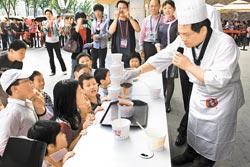 臺北館1日也舉行牛肉面試吃活動,許多游客攜家?guī)Ь,讓小朋友?yōu)先排隊嘗美食。