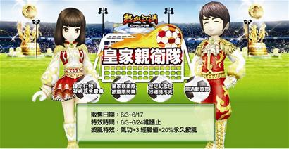 臺灣網(wǎng)游廠商也夠聰明,他們推出了應景的世界杯風格裝備產(chǎn)品。目前臺灣最熱血的武俠網(wǎng)游非華義旗下的“熱血江湖”莫屬。6月正值該游戲的改版升級階段,游戲服務商就順勢將6月打造成了“世足月”。其中最令球迷玩家興奮的就是,游戲地圖中將新增綠茵場為全新場景,游戲裝備也同步推出新款披風“皇家親衛(wèi)隊”。這款披風除了可以幫助玩家增加經(jīng)驗值、氣功攻擊力之外,還能讓玩家為自己喜愛的球隊加油打氣,在游戲中體驗拉拉隊的歡樂氛圍。(導報記者 燕子 綜述)
