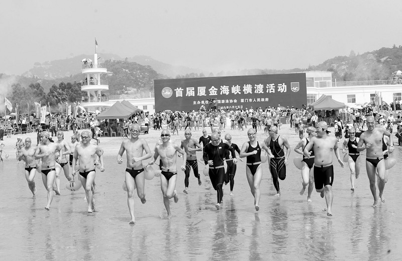 金門(mén)縣府為促進(jìn)兩岸體育交流,繼去年8月15 日舉辦2009金廈海域泳渡活動(dòng),兩岸97名游泳選手從福建廈門(mén)游到小金門(mén)雙口海灘,直線約6公里,今天規(guī)劃擴(kuò)大舉辦為金廈海峽橫渡接力賽,改為由金門(mén)游向廈門(mén)。