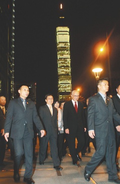 韓正于當日晚間還登上世界第二高樓臺北101大廈,其間更巧遇101大廈燈全亮,韓正贊“臺北夜景漂亮”。