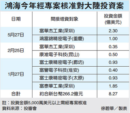 報(bào)道說,臺(tái)灣首富郭臺(tái)銘旗下的鴻海集團(tuán)今年仍不斷投資大陸,由投審會(huì)項(xiàng)目審查核準(zhǔn)的案子已有八件,累計(jì)金額8.27億美元,約新臺(tái)幣266億元。投審會(huì)執(zhí)行秘書范良棟指出,鴻海在大陸據(jù)點(diǎn)超過100個(gè),增資資金來源來自盈余,大陸事業(yè)獲利后,一部分匯回臺(tái)灣,一部分再投資。