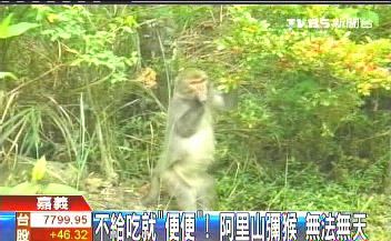 中新網(wǎng)12月21日電 據(jù)臺(tái)灣TVBS報(bào)道,阿里山現(xiàn)在也出現(xiàn)彌猴,猴子為了吃東西,還會(huì)雙手合十拜托民眾給香蕉吃,不過(guò)看到民眾不肯給,猴子居然調(diào)皮的,跳到民眾的車子上排泄,甚至還會(huì)把山上的花摘來(lái)吃,讓民眾好氣又好笑。