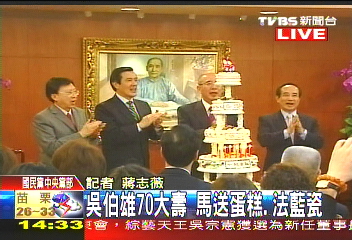 慶祝吳伯雄70歲大壽,包括馬英九、劉兆玄、王金平等人都到場致賀,給足面子,而馬英九也送上5層樓高的蛋糕,以及一個上面寫著“伯雄中興”的法藍(lán)瓷,國民黨“立委”洪秀柱更獻(xiàn)吻祝福。