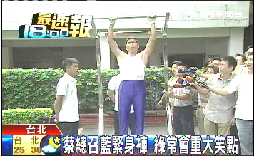 更有民進(jìn)黨中常委戲稱:“穿運(yùn)動(dòng)服當(dāng)然要穿運(yùn)動(dòng)鞋!标惷魑男ΨQ:“要穿綠色內(nèi)褲,怎么穿藍(lán)的?”蔡同榮解釋道:“我其實(shí)是請(qǐng)人家做,不知道他要,忘了跟他講(什么色)!