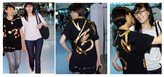 中新網(wǎng)6月29日電 據(jù)臺灣《聯(lián)合報》報道,馬英九夫人周美青27日晚送小女兒馬元中搭機回美國穿了件草書T恤,捧紅了這件臺北當代藝術(shù)館為“無中生有”特展設計的T恤,民眾踴躍搶購,館方已準備加印。