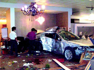 據(jù)臺(tái)灣《聯(lián)合報(bào)》報(bào)道,位于蘭陽(yáng)大橋南端的家具行前晚11時(shí)許還在營(yíng)業(yè),店員正帶客人看家具,突然聽(tīng)到“吱”一聲尖銳摩擦聲,接著“轟”的一聲,整臺(tái)銀色小轎車側(cè)撞進(jìn)來(lái),迎路整片落地玻璃撞碎,家具被撞飛,霹靂啪啦一片狼藉。