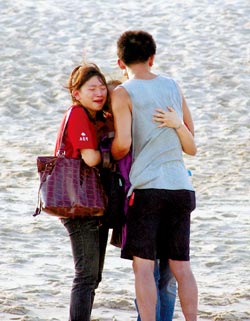 接獲惡耗的家屬相繼趕到后湖海灘,有人癱倒在親人懷抱中,不停哭喊愛子的名字,要他們趕快回來,有的則手持念珠面向大海,盼望出現(xiàn)奇跡,天下父母心的焦灼憂慮,讓蜂擁關(guān)切的民眾看了也心酸。