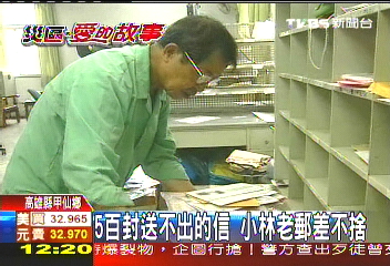 中新網(wǎng)8月19日電 高雄縣甲仙鄉(xiāng)小林村一夕之間滅村,甲仙郵局有一位專(zhuān)跑小林村的老郵差劉昭學(xué),他送信到小林村已經(jīng)有30多年,但臺(tái)風(fēng)到現(xiàn)在,累積成堆的小林村郵件,已經(jīng)2大箱,大約500多封信如今成了無(wú)法投遞的郵件,老郵差滿是遺憾和不舍。