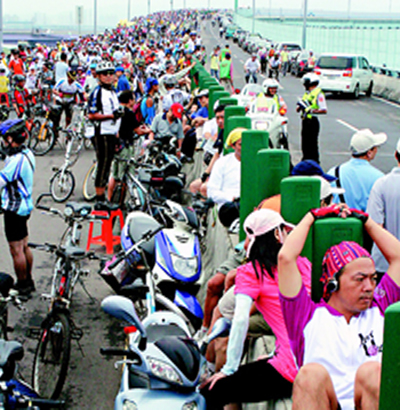 縣政府原計劃將無車日活動設(shè)在板橋文化路的捷運新埔站,要車友在這里集結(jié)上橋,后來報名參加車友實在太多,昨天緊急調(diào)整通車典禮會場至臺64線道路的16.3公里處,也就是五股交流道附近。沒想到清晨4時起就有車友成群結(jié)隊上橋,卻在16.3公里處被擋駕,他們耐心等候7時30分通車典禮,沒想到因人太多,近七萬車友和愛車就硬被堵在高架橋上。