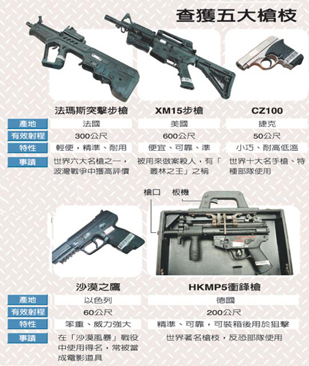 不乏島內(nèi)首見的槍型中,例如手提箱式MP5沖鋒槍,可從手提握把直接扣扳機,外觀與一般手提箱無異,使用者提著它走進人群,就算是“總統(tǒng)級”的維安也防不勝防,故有人稱它“要命的手提箱”,黑市價格應在百萬元以上,警方認為訂貨者動機可疑,準備用它來刺殺誰,有查明必要;另有9把以色列突擊步槍,浸泡海水后可立即使用,也是首次查獲。