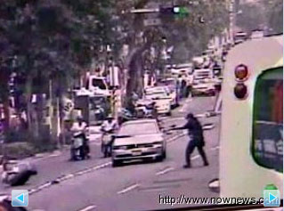 警匪正面駁火,兩人相隔一個車道,距離還不到4米,身中多槍的嫌犯多次跌倒又爬起,所幸最后終于被制伏。根據(jù)監(jiān)視器畫面,當(dāng)時正好是綠燈,警匪槍戰(zhàn)活生生在街頭上演,摩托車騎士急忙倒退,還有人趕緊繞跑。