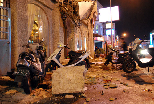 臺北市消防局表示,地震造成永吉路和復(fù)興南路各有一個置于屋頂?shù)乃袈洌髟覛?輛轎車,無人員傷亡。