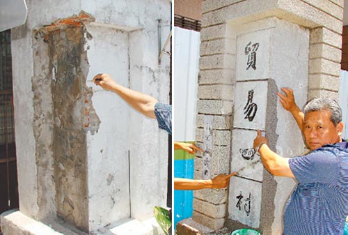 中新網(wǎng)5月20日電 據(jù)臺灣《聯(lián)合報》報道,臺南縣仁德鄉(xiāng)二空眷村將拆除改建大樓,包商日前把村門口由宋美齡落款題字“貿易四村”的石柱拆除,遭眷戶抗議并報警,指軍方與包商竊盜眷村文物。包商昨天把落款貼回,但損裂痕清楚可見。