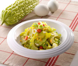 苦瓜含有豐富的維生素,只是苦瓜味道苦,許多大人、小孩都不愛,讓媽媽們實在傷透腦筋;但一道客家小炒“苦瓜黃金蛋”打破許多人不吃苦瓜的慣例,事前的準備工夫也很簡單,只要抓到降低苦瓜苦味的小撇步,馬上成為一道可口佳肴;尤其若能采用萃取自上等天然鮮雞的鮮雞晶來調(diào)味,不但能提升菜肴的鮮甜度,經(jīng)樞紐科技顧問公司專業(yè)證實,在等咸度下,還可以減少40%的鹽份攝取,對人體健康較無負擔。