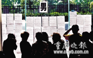 114號(hào)男士的資料顯示:28歲,身高1.78米,重大建筑系碩士畢業(yè),目前在江北區(qū)一事業(yè)單位做設(shè)計(jì)工作。母親張女士身旁坐了8位父母,排隊(duì)和她交談!拔遗畠涸谥貞c師范大學(xué)讀研究生,單位委培,長(zhǎng)得也秀氣!薄拔遗畠阂膊诲e(cuò),西南財(cái)大畢業(yè),在建行上班”……幾位媽媽相互比拼,張女士連忙拿出筆記本一一記下他們的電話,說(shuō):“條件都好,我們當(dāng)父母的只是搭橋,讓兒女們自己選吧!