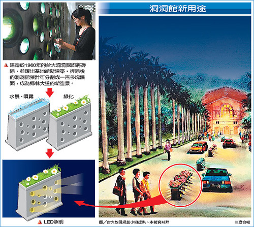 臺(tái)大校園規(guī)劃小組召集人劉聰桂昨天指出,為推動(dòng)“改善椰林大道計(jì)劃”,決定將洞洞館墻重新利用,制成移動(dòng)式LED分隔島,提供椰林大道交通分道、綠化及照明等功能,“讓‘洞洞館’再生”。
