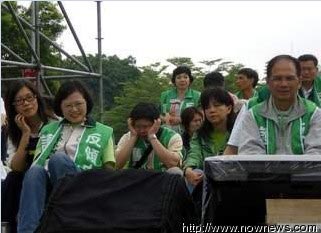 至于謝長廷,也因為精神不濟,先到后臺稍做休息,而靜坐舞臺上,僅剩黨主席蔡英文和游錫堃率領部分黨公職坐在臺上,聽著新聞關心時事。此外,現場也可發(fā)現,部分“立委”因靜坐一宿,體力已超出負荷,紛紛在舞臺上打起瞌睡,有的人甚至悄悄地消失不見了。