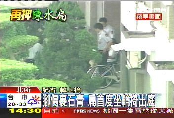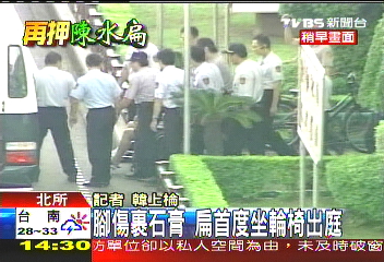 中新網(wǎng)7月15日電 據(jù)臺(tái)灣TVBS報(bào)道,陳水扁15日下午再度出庭,由于腳受傷,陳水扁必須打石膏坐輪椅出庭,在庭上,陳水扁向?qū)徟虚L(zhǎng)抱怨臺(tái)北看守所的醫(yī)生醫(yī)術(shù)差。