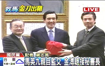 國(guó)民黨新舊秘書長(zhǎng)交接儀式上,金溥聰從詹春柏與馬英九的手上接下印信,報(bào)道稱,這象征其扛下國(guó)民黨這部大機(jī)器的開始。
