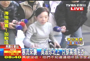 中新網(wǎng)1月13日電 據(jù)臺灣TVBS報道,超強(qiáng)寒流襲臺,陳水扁夫人吳淑珍13日搭乘高鐵北上出庭,對于兒子、兒媳上電視接受專訪,她表示尊重他們。