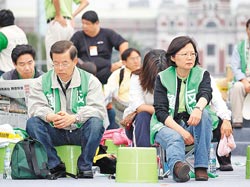去年民進(jìn)黨517游行,靜坐凱達(dá)格蘭大道24小時,當(dāng)時民進(jìn)黨主席蔡英文(右)獨自沉思、謝長廷(左)則閉目養(yǎng)神。