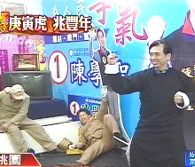 陳學(xué)圣自認長得像甄子丹,穿起馬褂學(xué)葉問比劃詠春拳,山寨版的功夫比較像搞笑拳,他扮葉問出招有事要問蔡英文。