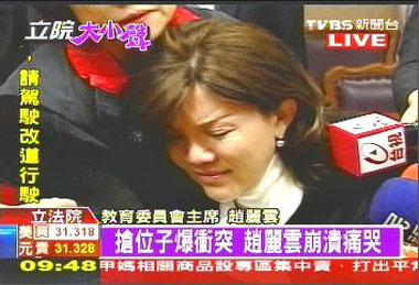 而上個(gè)星期才因?yàn)闆_突昏倒送醫(yī)的“主席”趙麗云,26日再度看到這樣混亂場(chǎng)面,一度痛哭!敖逃瘑T會(huì)主席”趙麗云:“我們要開(kāi)會(huì),我們要按規(guī)則開(kāi)會(huì),請(qǐng)所有的不管那個(gè)黨派的,要對(duì)得起人民,我們是拿薪水來(lái)開(kāi)會(huì),不是來(lái)打架的!