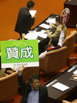 稍早,表決大戰(zhàn)進(jìn)行到晚間6時(shí)30分左右,會(huì)議主席曾永權(quán)宣布休息。兩黨黨團(tuán)隨即進(jìn)行協(xié)商,民進(jìn)黨團(tuán)同意讓步,撤掉部分提案,但加上國(guó)民黨團(tuán)提案,公營(yíng)事業(yè)預(yù)算總計(jì)還余300多案必須表決。