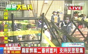 中新網(wǎng)6月11日電 據(jù)臺(tái)灣TVBS報(bào)道,陳水扁家族涉及的公務(wù)機(jī)要費(fèi)、南港展覽館、龍?zhí)顿彽丶跋村X案等案,臺(tái)灣高等法院于11日上午二審宣判;高等法院場外聚集了一堆挺扁、反扁民眾等候判決結(jié)果,警方派出大批警力,進(jìn)行周邊出入管制,嚴(yán)防沖突發(fā)生。
