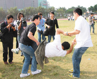 廖姓學生與安全人員拉扯,躺在地上大喊“樂生依法定古跡”,被抬離現(xiàn)場。同行一名瘦小的王姓女學生走近想幫忙,卻被安全人員來一記過肩摔,雖無明顯外傷,已受到驚嚇。不少學生氣憤地說:“嗆得好,我們都快活不下去了!