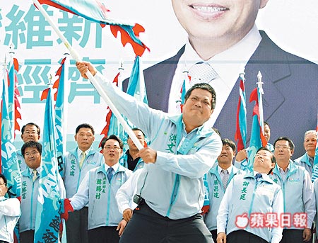 報道說,“長昌配”高雄縣競選總部昨天成立,在謝、蘇授旗給各后援會干部時,由于旗桿太長,差點打到站在后面的謝長廷與高雄縣長楊秋興,謝、楊頻頻后仰閃避。職工后援會長蘇炎城揮旗時,旗桿突然斷成兩截,旗面拋飛出去,謝長廷微怔,蘇貞昌與楊秋興則十分錯愕。(周先)