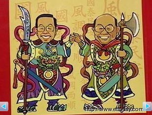 原本農(nóng)歷上的門神變成了謝長(zhǎng)廷與蘇貞昌兩人的卡通造型,底下一行“長(zhǎng)”治久安,更是意有所指。