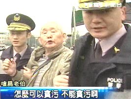 陳水扁在會上依舊鼓吹推動“入聯(lián)公投”,但沒想到臺下卻有民眾嗆扁,嗆扁民眾隨即被警察帶走;但又有民眾高喊:“阿扁下臺!”嗆扁老伯念念有詞:“怎么可以貪污,不能貪污。 崩喜S后同樣也被架走。(高大林)
