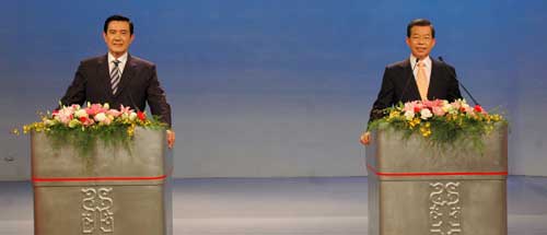 中新網(wǎng)3月8日電 據(jù)臺灣《中國時報》報道,馬英九、謝長廷昨晚在第二場政見發(fā)表會上炮火猛烈、火力四射,互批對方使出“奧步”(賤招),不斷攻擊對手家人。兩人還不約而同為太太抱屈,馬英九不滿周美青被封為“股神”,且呼吁謝應(yīng)有領(lǐng)導(dǎo)人的高度;謝長廷則怒斥對手將游芳枝取名“布袋枝”。