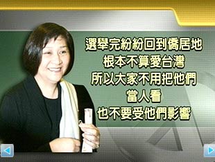不過,這兩人的說法都不被馬陣營所接受。馬陣營發(fā)言人蔡詩萍表示,從來都不認(rèn)為挺綠、支持民進(jìn)黨候選人謝長廷的人不是臺灣人,也不會拿挺綠的藝人來消費(fèi),但今天要為挺藍(lán)的藝人說句公道話,挺藍(lán)藝人絕對不是如江霞、葉菊蘭所說的“不是臺灣人”。