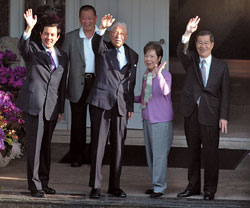 馬英九、蕭萬(wàn)長(zhǎng)27日下午4時(shí)半抵達(dá)李登輝寓所翠山莊。李登輝和夫人曾文惠在門(mén)口迎接馬蕭,四人臉上堆滿笑意。李登輝、馬英九主動(dòng)向守候媒體揮了揮手,隨后一起走進(jìn)屋內(nèi)。