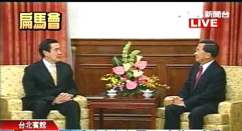 在陳水扁邀請(qǐng)下,馬英九今天上午10點(diǎn)半在臺(tái)北賓館會(huì)面,雙方展開3對(duì)3的會(huì)談。